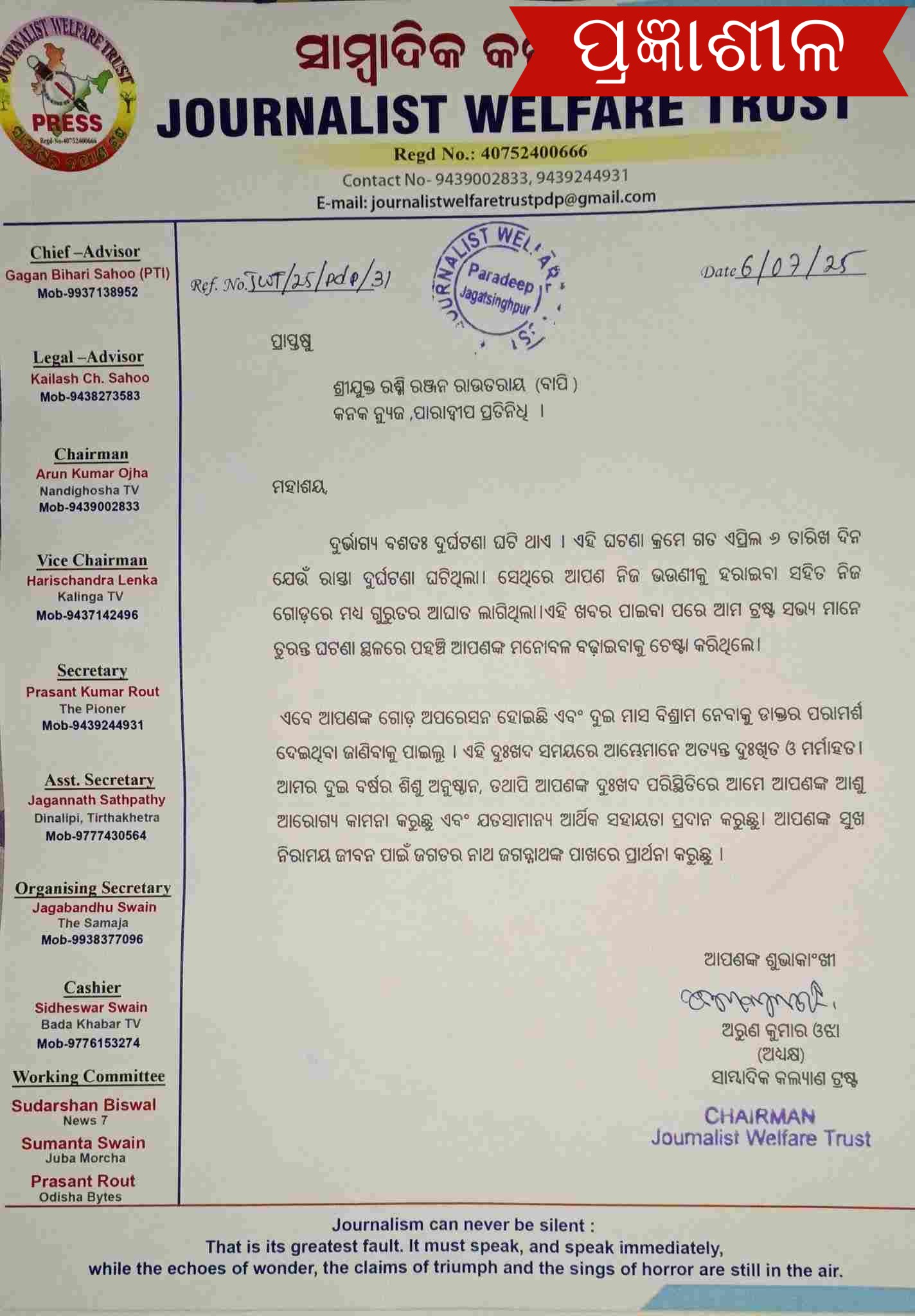 ଦୂର୍ଘଟଣା ରେ ଆହତ ସାମ୍ବାଦିକ ଙ୍କୁ ସହଯୋଗର ହାତ ବଢ଼ାଇଲା ସାମ୍ବାଦିକ କଲ୍ୟାଣ ଟ୍ରଷ୍ଟ।